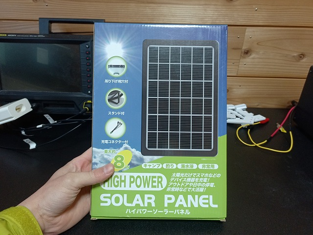 まずはソーラーパネル。今回たまたまスマホ充電用のものがドン・キホーテで安価に販売されているのを見つけました。