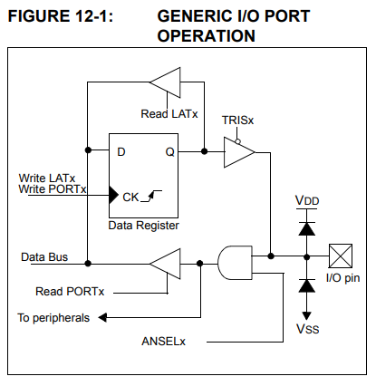 データラッチ(LATxレジスタ)は、I/Oピンが駆動している値に対するリード・モディファイ・ライト操作に役立ちます。