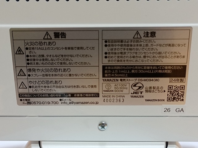 山善製の石英ヒータになります。