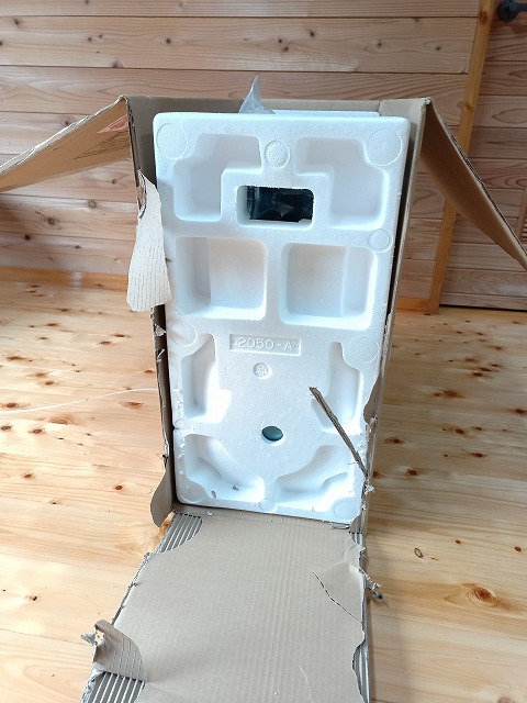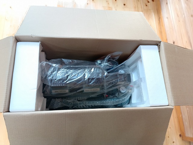コンプレッサー本体を左右から発泡スチロールで挟み込むように梱包されています。