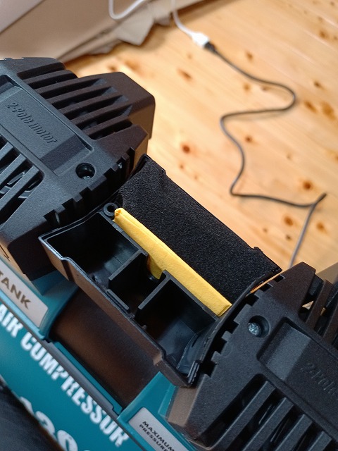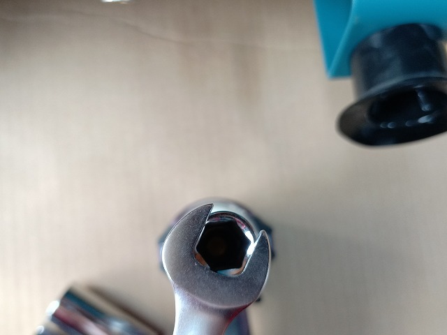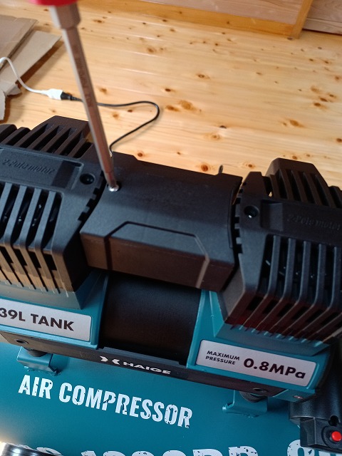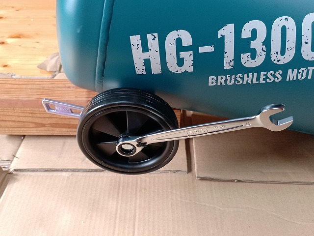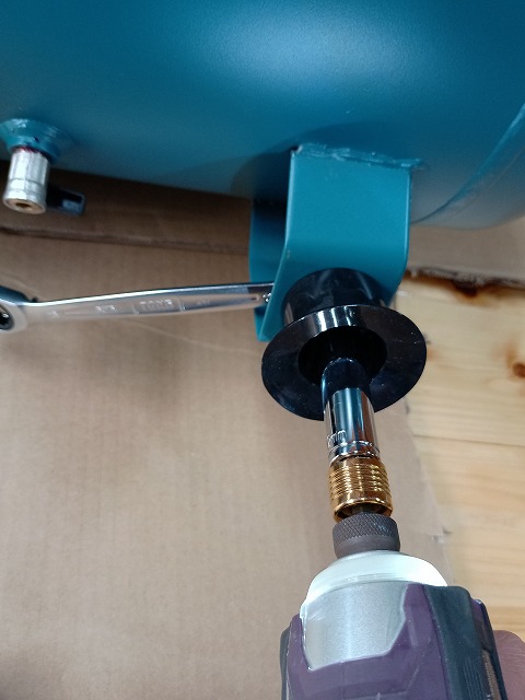 ここもまたタイヤと同様ですが、取り付ける際はコンプレッサーをひっくり返してレンチとソケットレンチを使って締め付ける必要があります。