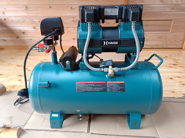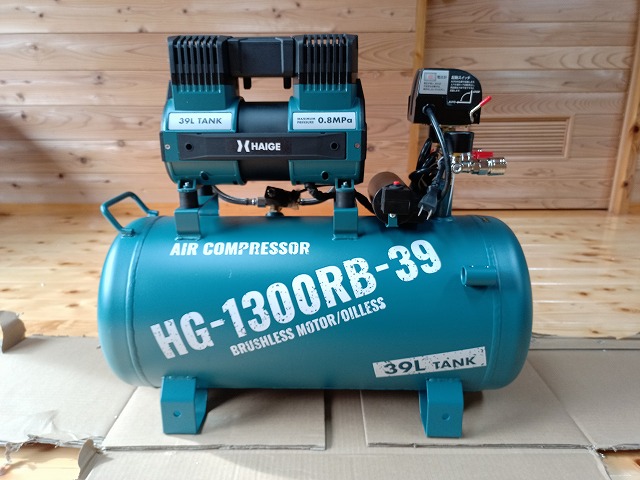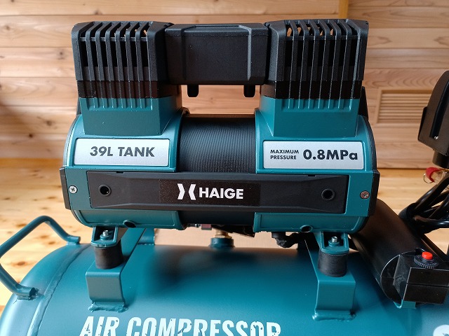 今回購入したのは、ハイガーという会社の39Lタンク、オイルレスコンプレッサーです。