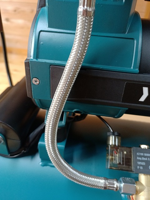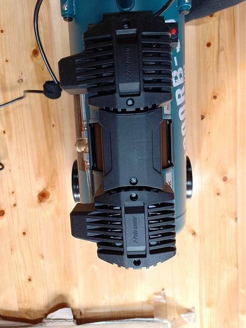 モータの部分からタンクにつながるホースが2つあることから、なんとなくお察しいただけたと思いますが、贅沢なことに2つのモータで空気圧縮を行っています。